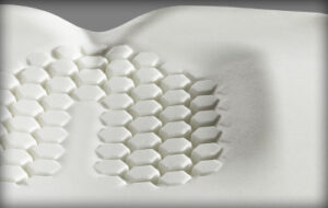 With a special emphasis on the area that distributes pressure around the tissues that support the bony prominences. Deeper hexagonal shapes allow for increased immersion with better envelopment.
