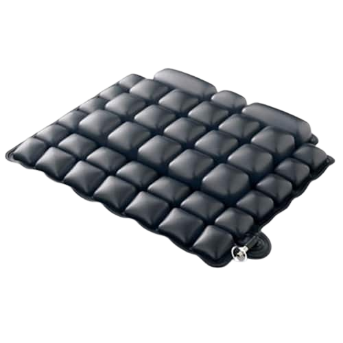 The LTV Seat wheelchair cushion with a black quilted cover is made up of individual air cells that allows air to transfer from chamber to chamber to evenly distribute body weight..