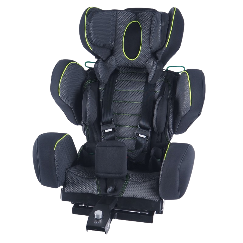 The Simon car seat is specially designed for children that need extra support and comfort while traveling, with highly adjustable trunk, pelvic, and head supports to ensure their safety and security.